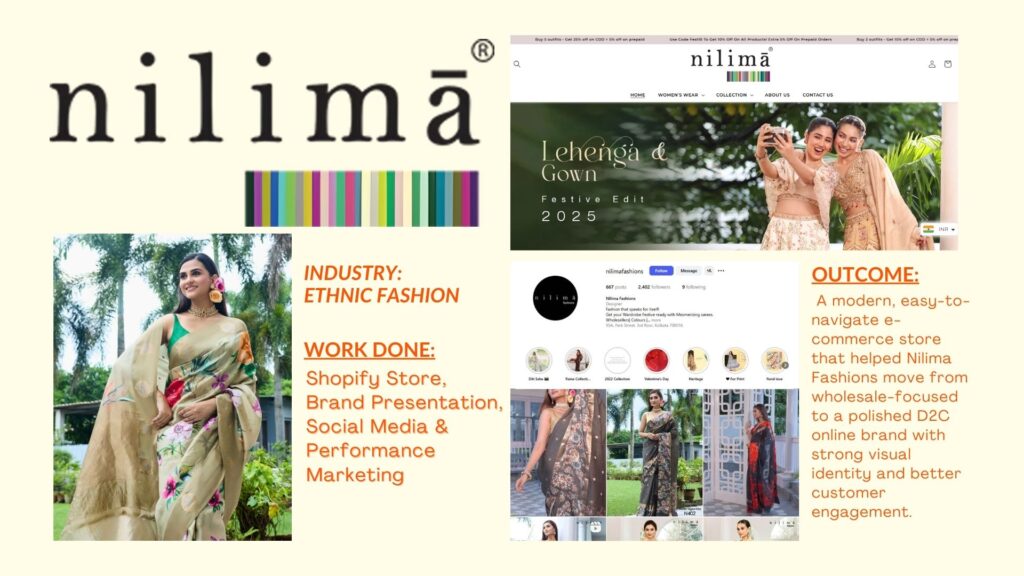 Built B2B branding for Nilima Fashions and launched a complete D2C Shopify store for Nilima Creation with clean product presentation and a strong visual identity.