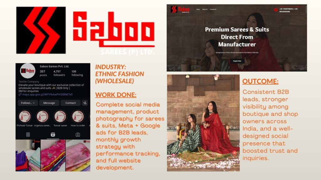 Managed Saboo Sarees’ social media and Meta ads, delivering strong B2B leads from boutique owners across India with high-quality creatives and product shoots.