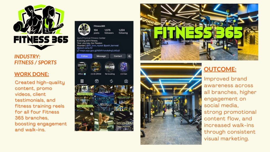 Created high-quality content, promo videos, client testimonials, and fitness training reels for all four Fitness 365 branches, boosting engagement and walk-ins.
