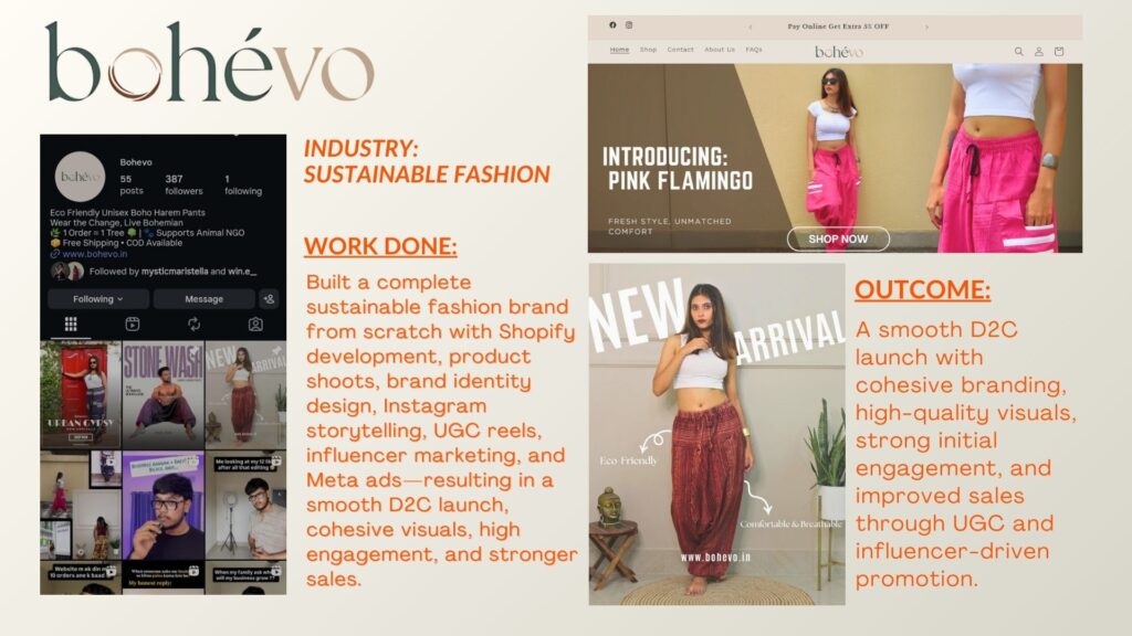 Built a complete sustainable fashion brand from scratch with Shopify development, product shoots, brand identity design, Instagram storytelling, UGC reels, influencer marketing, and Meta ads—resulting in a smooth D2C launch, cohesive visuals, high engagement, and stronger sales.